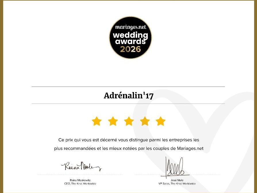 La qualité de ses services a valu à Adrénalin'17 le wedding awards 2026 du site mariages.net après l'avoir déjà obtenu en 2024.